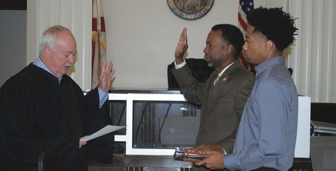 Greensboro’s new mayor, Ralph A. Howard, takes the oath of office at the Hale County Courthouse on Monday, Nov. 3, with Probate Judge David Parker administering the oath and Howard’s son, Tre, holding the Bible.